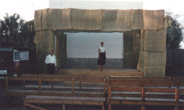 In Kabul empfing uns deutsche Gemütlichkeit, man half uns, das Auto in eine Mercedes-Werkstatt zu bringen, half beim Aufbau der Bühne in der amerikanischen Botschaft und man machte mit uns ausgedehnte Stadtbesichtigungen. Kabul liegt hoch, nachts ist es kalt (6° Celsius), oft toben Sandstürme, es ist umgeben von schneebedeckten Gebirgsketten, in der Ferne liegt der Hindukusch. Es liegt am Fuße des Great Babrus, oben ist eine Festung und täglich um 12 Uhr wird aus einer Kanone 3 mal geschossen. Die Straßen sind breit, es gibt ein Universitätsgelände, einen Bahnhof des Scheichs Aman-Ullah, sein Lustschlösschen und ein modernes, großes Theater und ein Museum. Unser Klassikerabend: "Die Mitschuldigen" von Goethe und "Der Heiratsantrag" von Tschechov fand vor 350 Personen statt. Illustres internationales Publikum: in der ersten Reihe wurde dem amerikanischen Botschafter leider ziemlich laut übersetzt. Wir erfuhren auch, daß es eine afghanische Laienspielgruppe gab, die uns herzlich bewunderte.