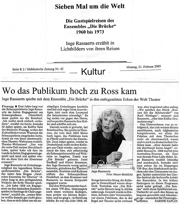 Gestern war Premiere von „Glas Wasser“, ich glaube, ich war recht gut, der Regisseur war jedenfalls begeistert von mir, das Publikum aber sagenhaft idiotisch, kaum Reaktionen Das Einzige was ankommen würde: ist Hose runterlassen Wir Schauspieler waren entsetzt, denn alle waren gut, Kostüme, Maske, Bühnenbild, tipp topp. Die Leute sind hier Theater ungewohnt, nur die jüdischen Emigranten verstehen es, ein älterer Wiener erzählte mir, dass die berühmte Burgschauspielerin Nora Gregor in Santiago gestorben ist.